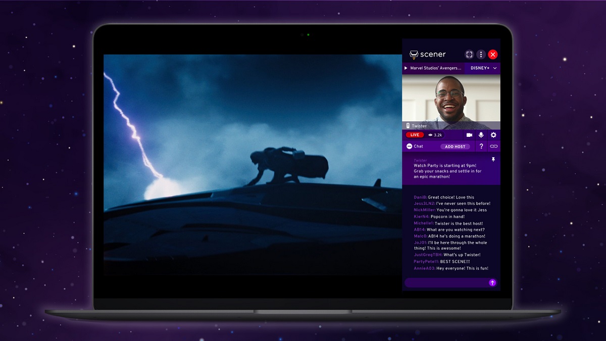 Creators can set up a profile at Scener.com to host public or private watch parties. Scener’s virtual theaters can theoretically hold up to 1 million viewers with live video chat and interactive messaging features running over synchronized playback of the streaming content.