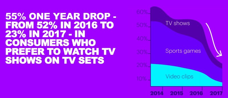 The decline in TV viewing over the past year is part of a four-year trend. As recently as 2014, the survey revealed that nearly two-thirds (65 percent) of consumers preferred the TV set for viewing TV shows.