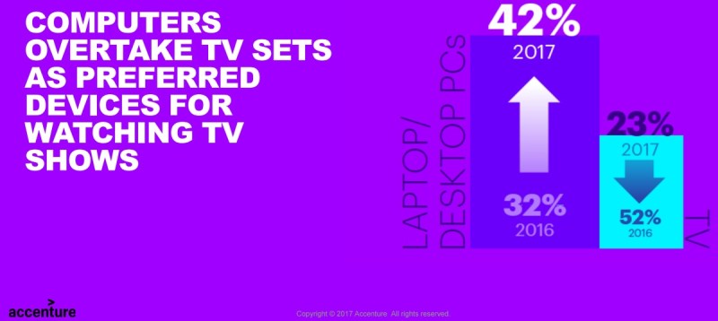 “The dominance of the TV set as the undisputed go-to entertainment device is ending,” said Gavin Mann, global managing director for Accenture’s broadcast business, in a statement. “While a great number of people still watch plenty of TV shows on TV sets, our research uncovers a rapid acceleration in their preference for viewing on other digital devices — especially laptops, desktops, and smartphones.”