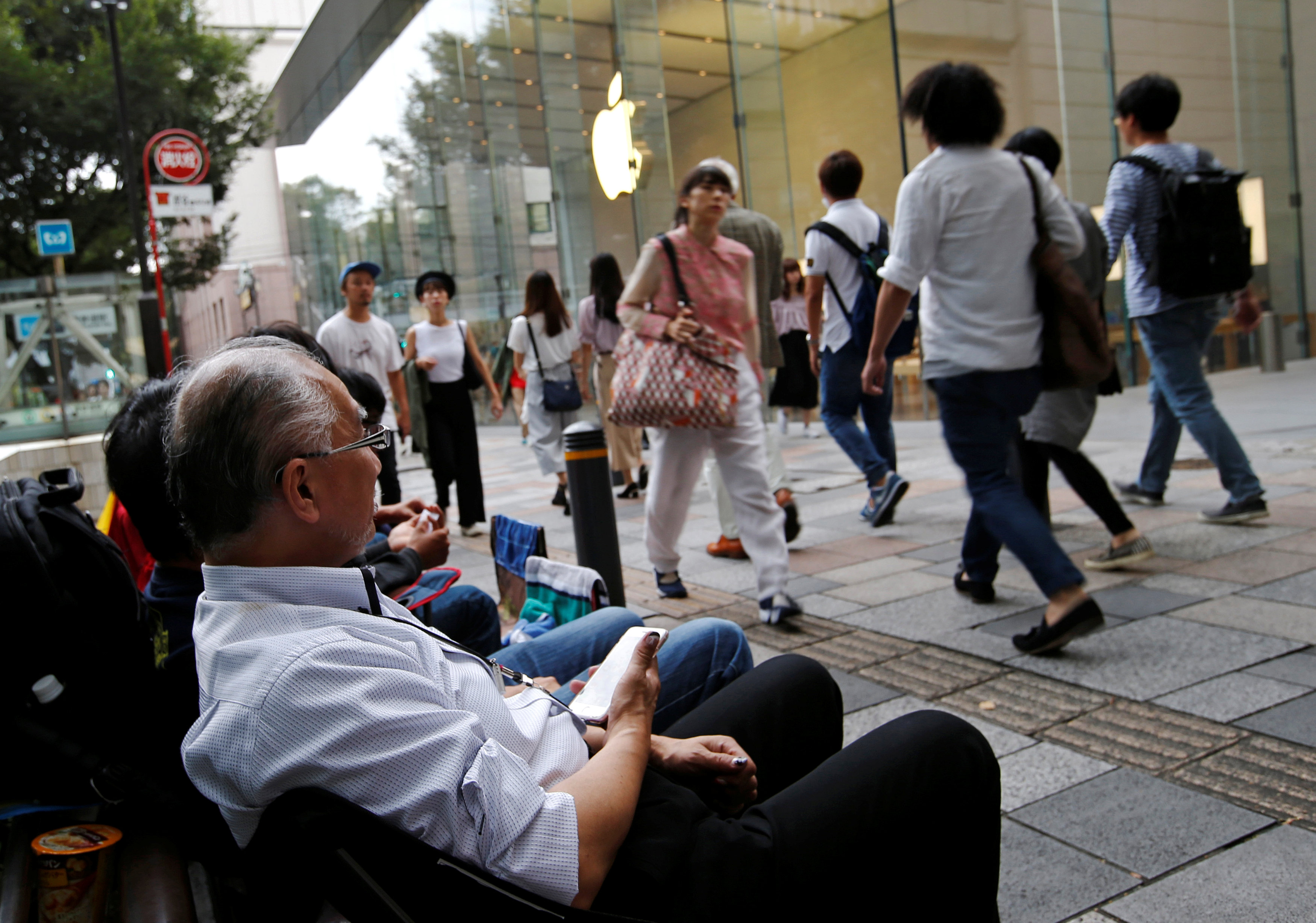 People sit in queue for the release of Apple’s new iPhone 7 and 7 Plus in front of the Apple Store in Tokyo’s Omotesando shopping district, Japan September 15, 2016.