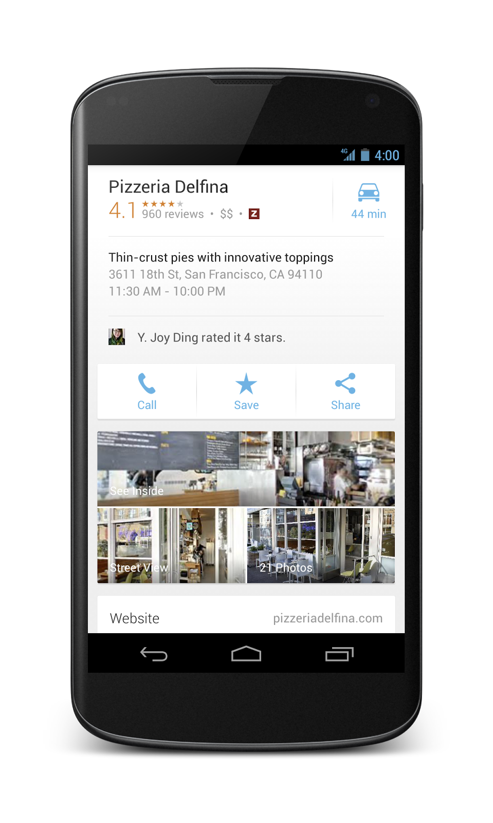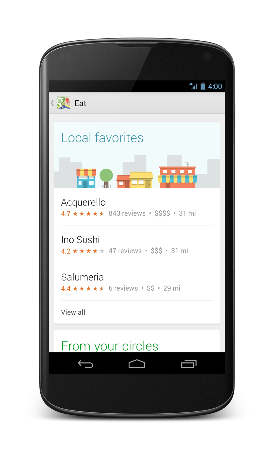 The first new feature is called “Explore,” and it lets you browse nearby places with a few taps. The places listed are for eating, drinking, sleeping, and shopping. Google has also implemented a 5-star rating on places like restaurants and bars that appears to replace Zagat’s 30-point rating system.
