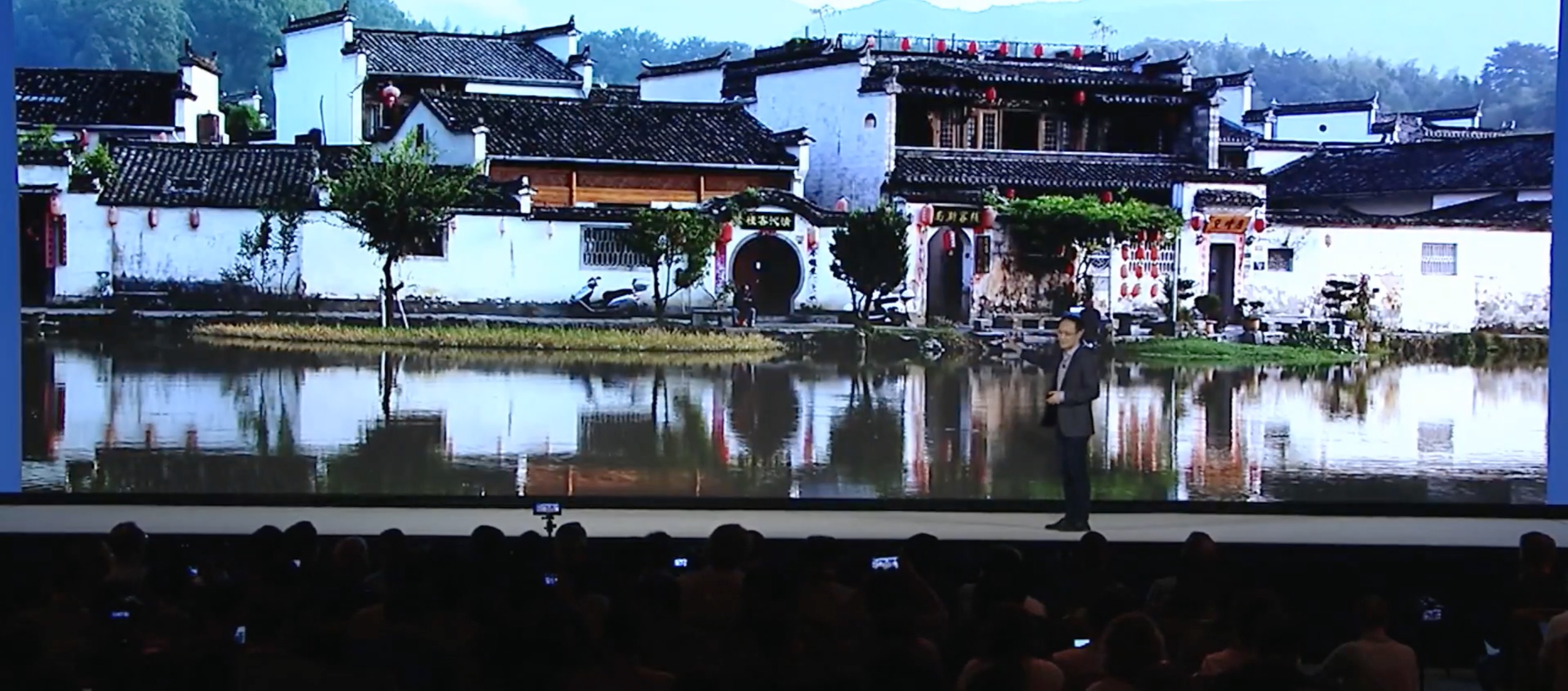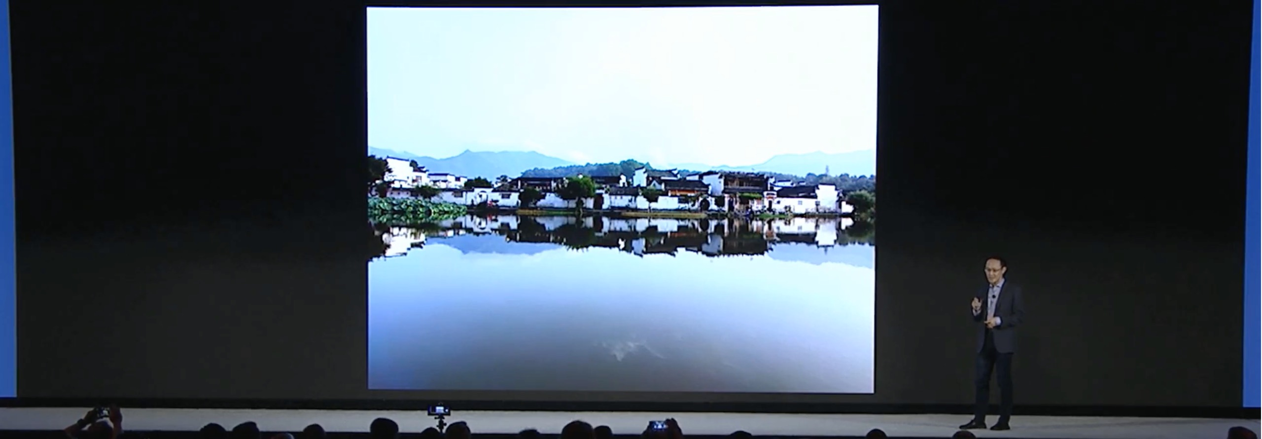Above: Xiaomi president Bin Lin walks in front of only a portion of a zoomed-in 108-megapixel image, displayed on a gigantic 4K screen.