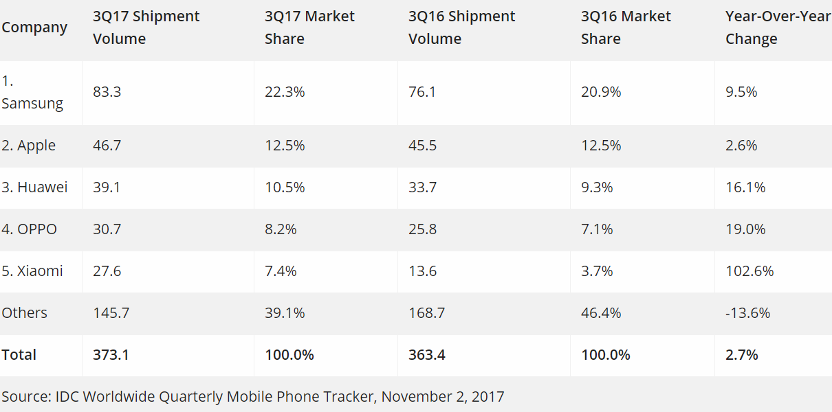 After a rare contraction of the smartphone market in Q2 2017, smartphone vendors shipped a total of 373.1 million smartphones worldwide in Q3 2017, up 2.7 percent from the 363.4 million units in Q3 2016. The top five (Samsung, Apple, Huawei, Oppo, and Xiaomi) all shipped more units, and all except Apple gained share as a result.