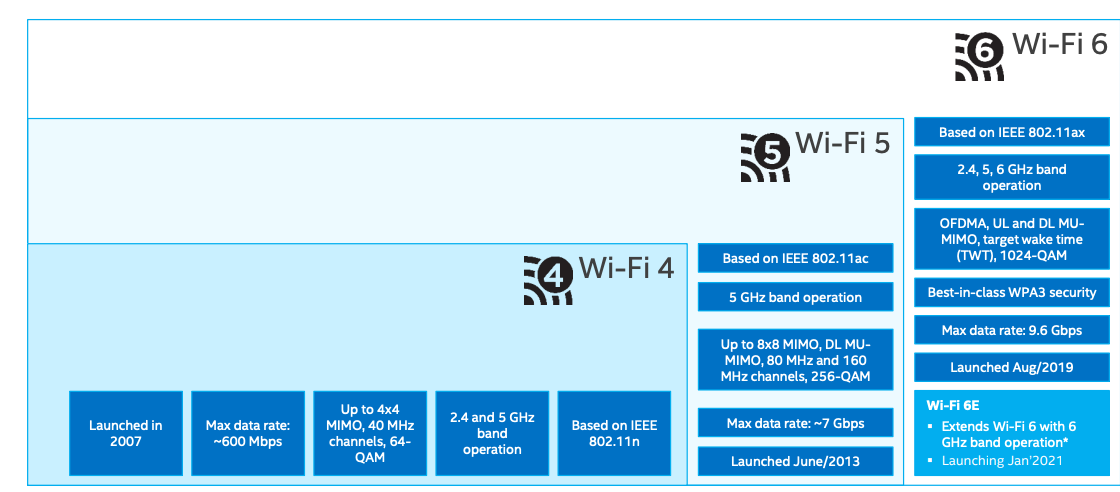 Wi-Fi 6 (802.11ax) in August 2019. Based just on top-line specs, the improvements over Wi-Fi 5 seem modest. For a single user, Wi-Fi 6 is only 37% faster — and that’s with adding back 2.4 GHz spectrum alongside 5 GHz support. Channel bandwidth tops out at 40 MHz under 2.4 GHz, but reaches a full 160 MHz in 5 GHz. Wi-Fi 6 steps into 1024-QAM, preserves support for eight spatial streams (8×8), and also does MU-MIMO. When maxed out, Wi-Fi 6 yields a maximum data rate of 9.6 Gbps.