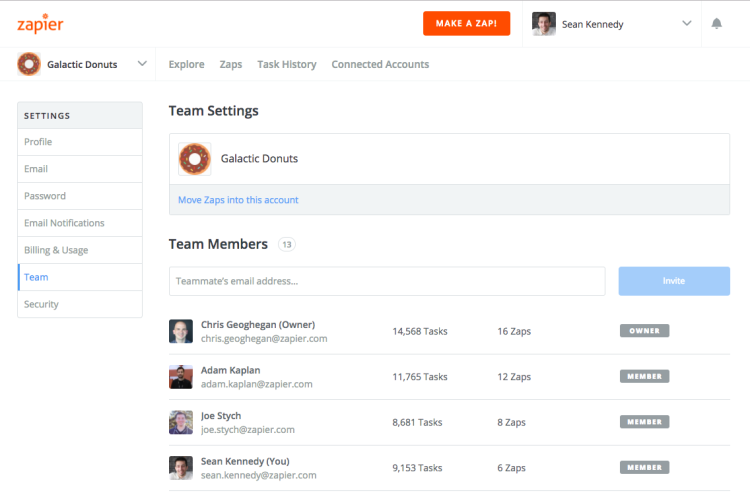 Now anyone can create a team, and the creater — who could be an engineer or someone in IT — is automatically designated the administrator and owner of the account. They then enter the billing information where everything will be charged across the team. Existing zaps can be transferred to the team from individual accounts, and anyone can modify team accounts, even when the original user isn’t around.