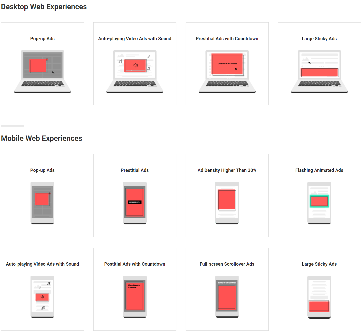 The Ad Experience Report tool provides screenshots and videos of annoying ad experiences to help sites find and fix issues. For a full list of ads to use instead, Google offers a best practices guide.