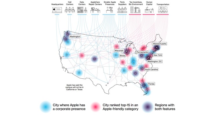 Even though Apple announced a major U.S. campus in January, pundits have barely speculated as to its location — partially because Apple’s process is opaque, unlike Amazon’s highly publicized “pitch your city for HQ2” campaign. This morning, Bloomberg handicapped Apple’s likely top prospects, relying largely on economic metrics to identify 17 potential campus locations spread across the United States. My view is that Apple’s list of possible locations is much smaller, and geographically focused on the East Coast.