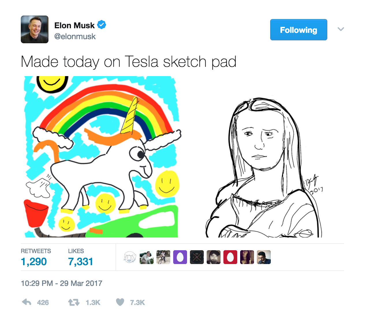 Musk shared his creations, which he posted on Twitter Wednesday evening. One drawing shows what magical resource might be powering Tesla vehicles—at least in Musk’s imagination; the other depicts Mona Lisa.