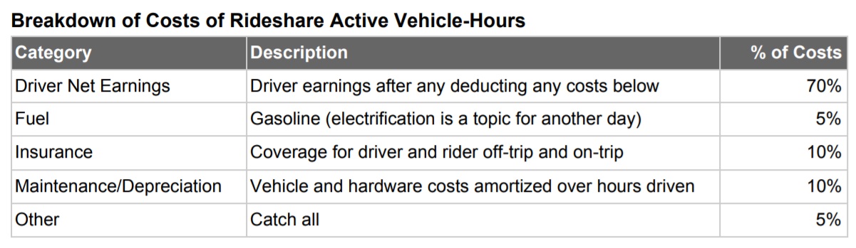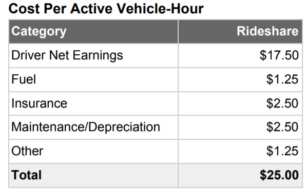 Now let’s say the cost of getting a rideshare car onto the network for an hour is $25. At that rate, the costs per hour break down as follows: