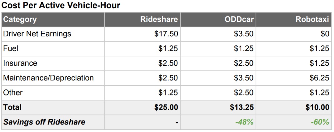 Finally, let’s wave our magical hands and see how these rideshare costs stack up against those of an ODDcar and a fully autonomous Robotaxi.